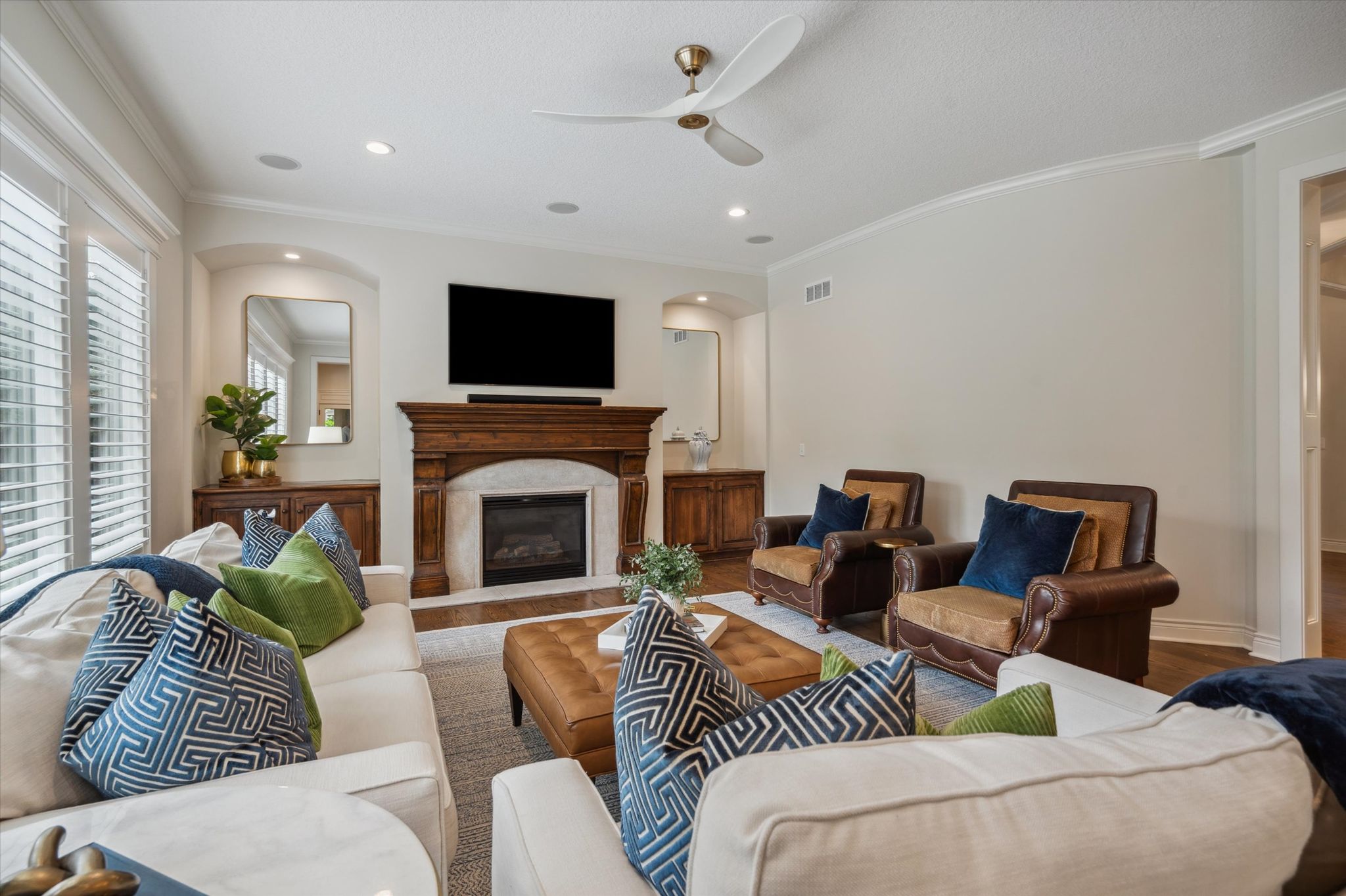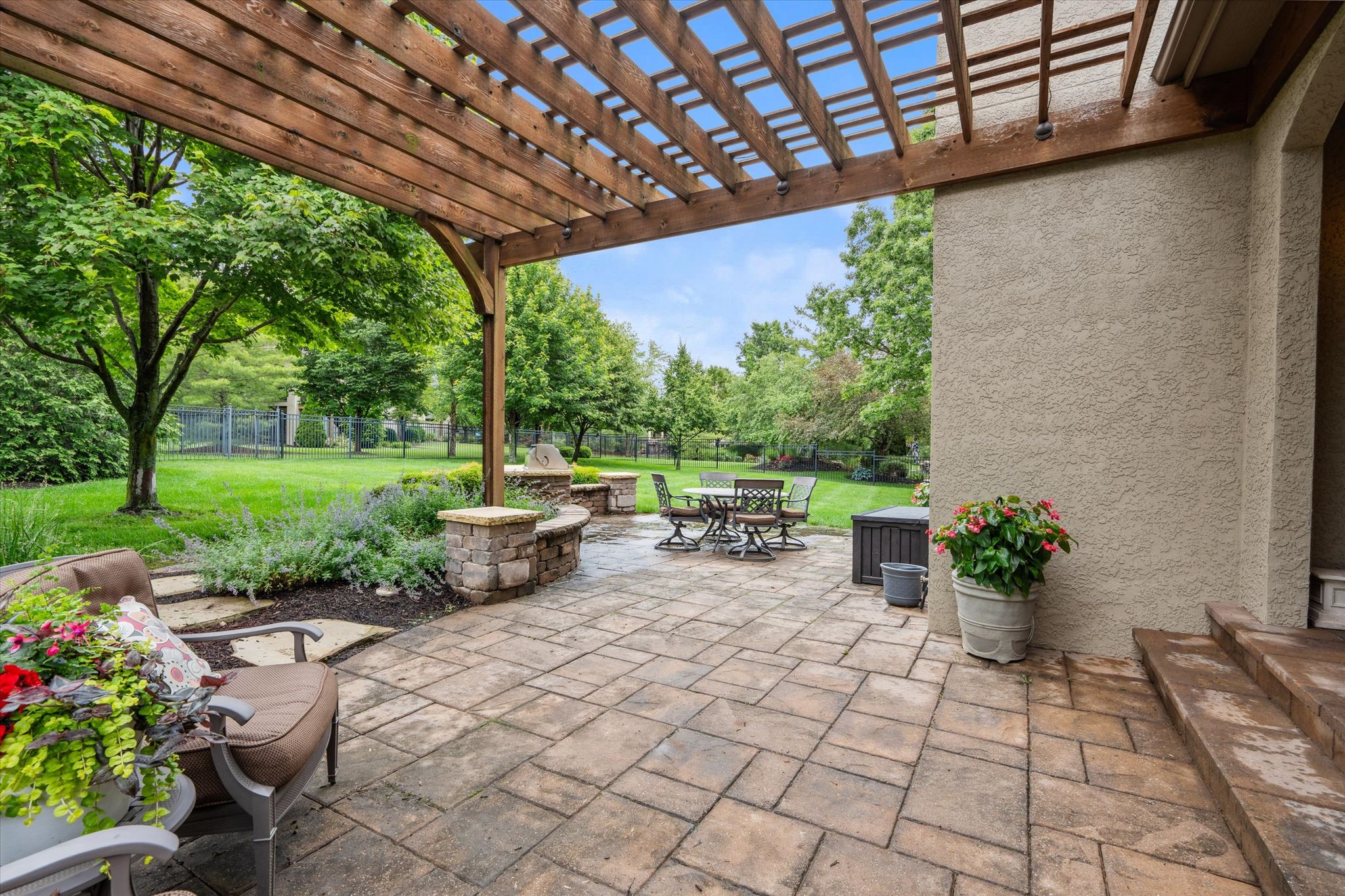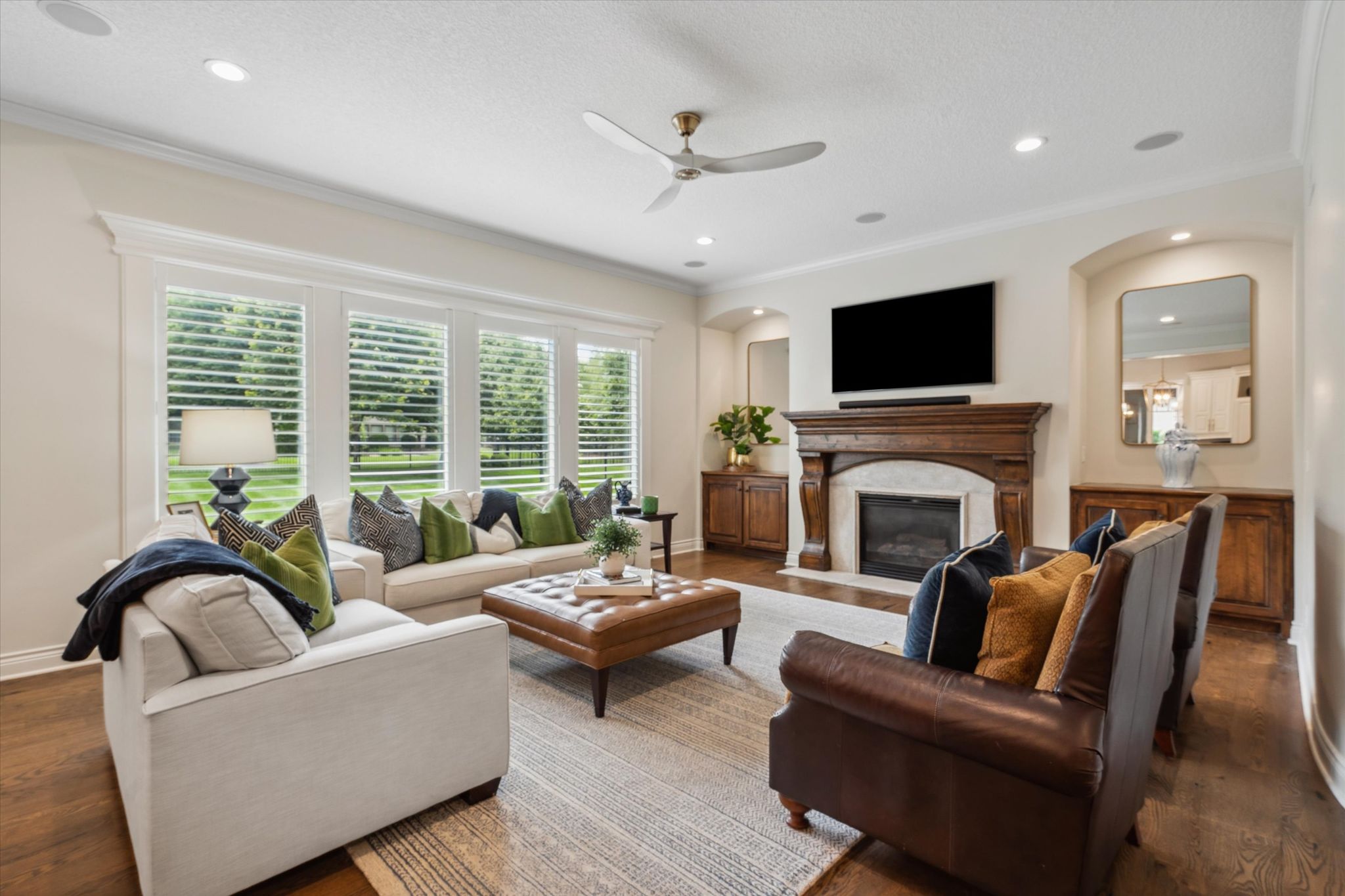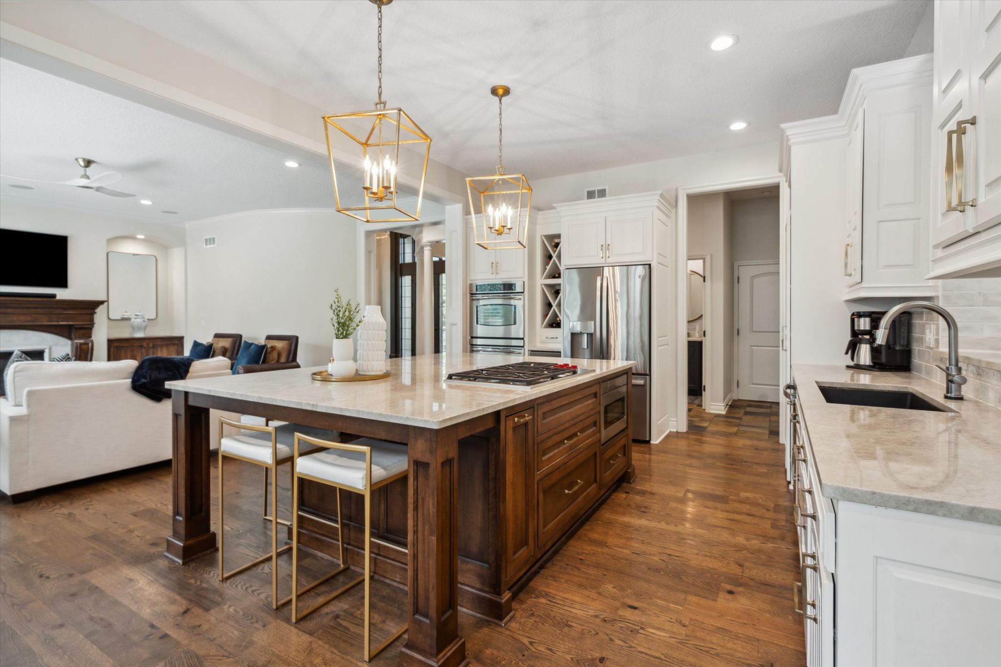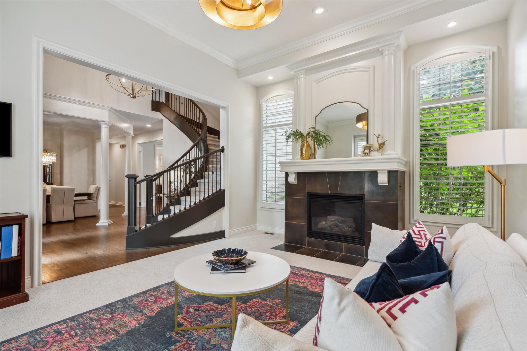 Welcome to this stunning 2-story home nestled in the heart of Mills Farm, one of South Johnson County’s most prestigious and family-friendly neighborhoods. A grand curved staircase and soaring ceilings welcome you as you walk in. Flanking the foyer are a formal living room with 12-foot ceilings and an elegant formal dining room—perfect for hosting gatherings or holiday dinners. The spacious great room is bathed in natural light and features custom built-ins, a beautiful fireplace, and flows seamlessly into the designer kitchen—a true showpiece with a massive island, spectacular Taj Mahal Quartzite countertops, Wolf gas cooktop, double ovens, generous storage, and plenty of seating. Just off the kitchen is a sunny eat-in area and a private main floor office with built-ins and direct access to the lanai. The outdoor living spaces are just as impressive. Enjoy summer barbecues or evening relaxation on the expansive lanai with a brand-new cedar ceiling and outdoor fireplace, plus a patio with built in grill area & a pergola that looks out to the large, flat, and private backyard—perfect for play or entertaining. Upstairs, you’ll find three spacious guest suites, each with walk-in closets and private en suite bathrooms. The luxurious primary suite is a true oasis with tons of space, a fireplace, and storage. The primary bath includes dual sinks, a vanity, large whirlpool tub, a walk in tile shower, a massive walk-in closet and a built-in coffee/wine station. Additional highlights include recently refinished hardwoods on the main floor, new carpet throughout, the most charming half bath on the main level, and a massive unfinished basement offering endless opportunities. Located in the award-winning Blue Valley School District, with Timber Creek Elementary conveniently within the neighborhood, Mills Farm offers unbeatable community amenities: multiple pools, a waterslide, tennis courts, a beautiful clubhouse, and playgrounds.